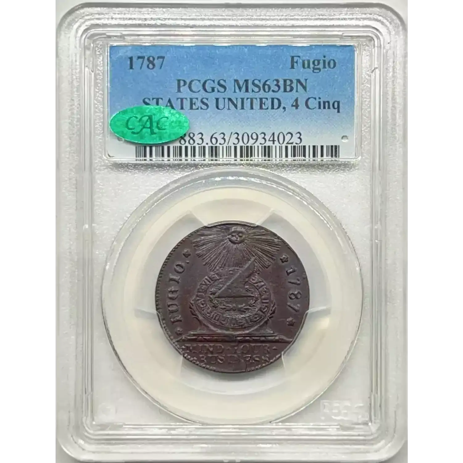 1787 1CPCGS MS63BN CAC Fugio Cent, 4 Cinq