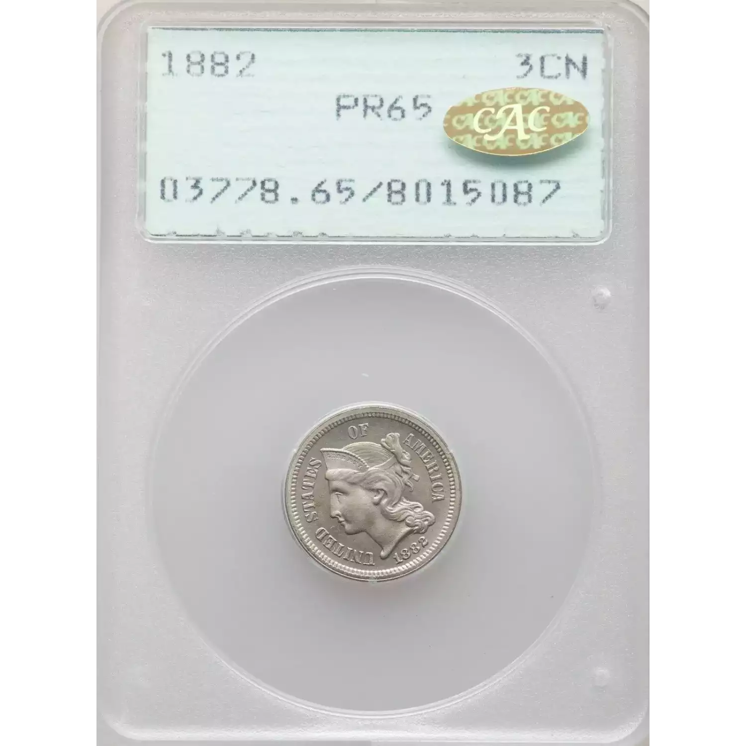 1882 3CN PCGS Rattler PR65 Gold CAC 3 Cent Nickel