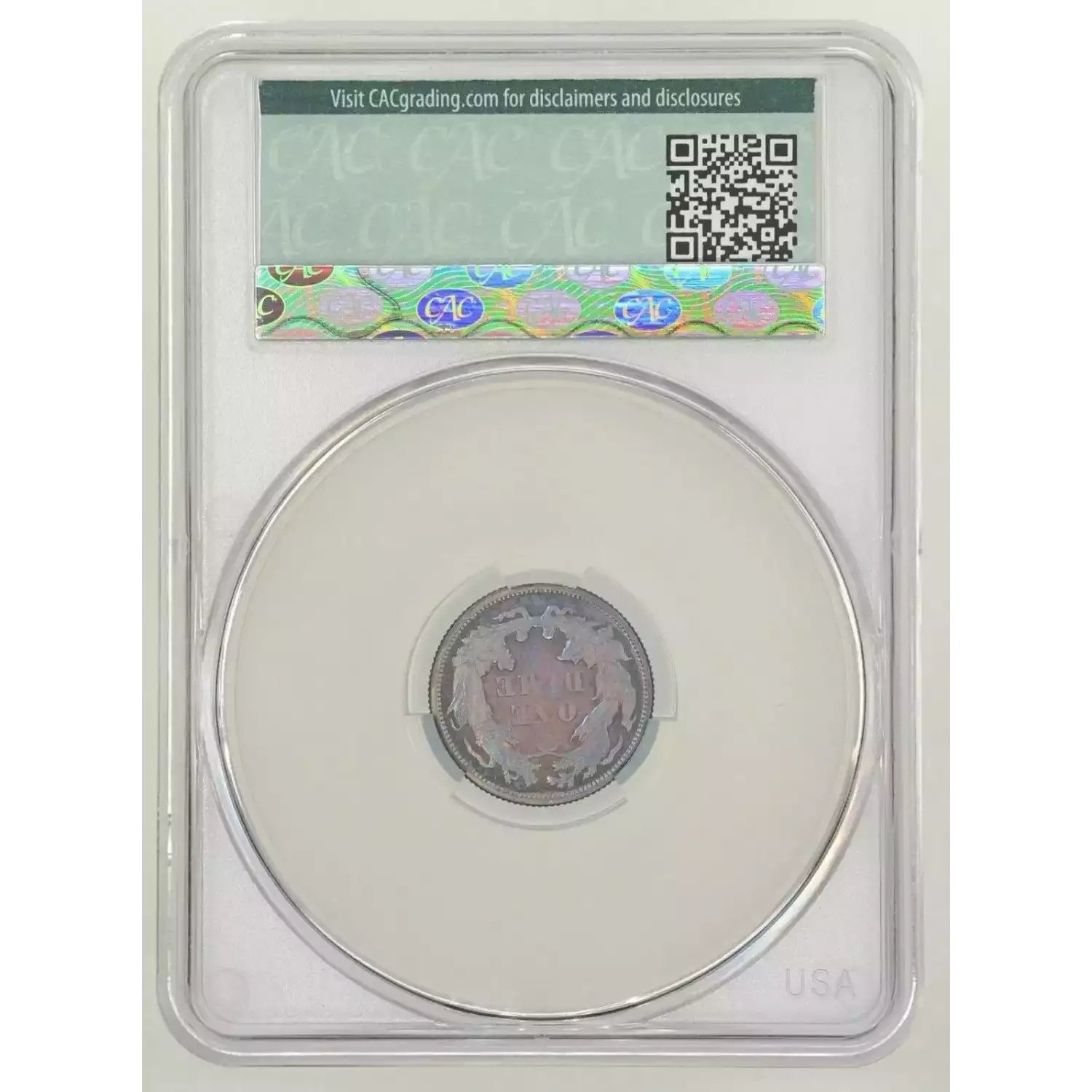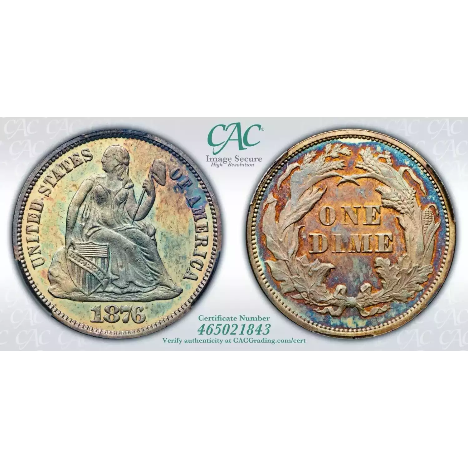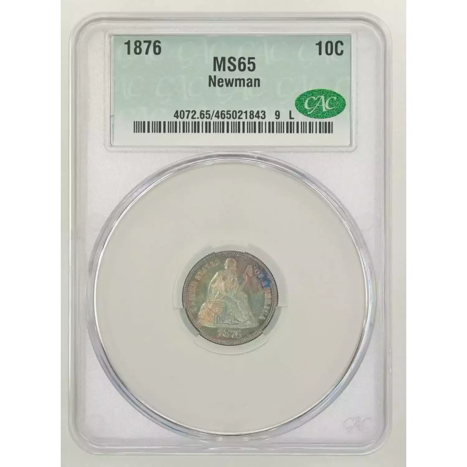 1876 10C CACG MS65 Rainbow Toned Seated Liberty Dime