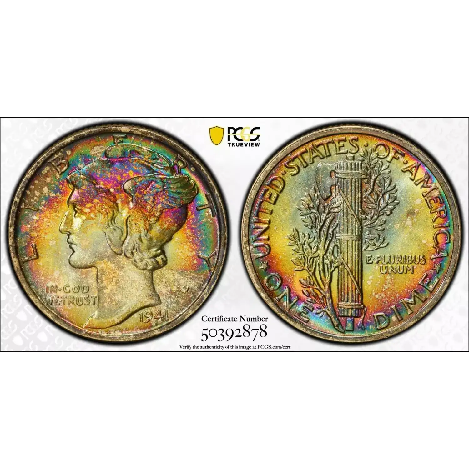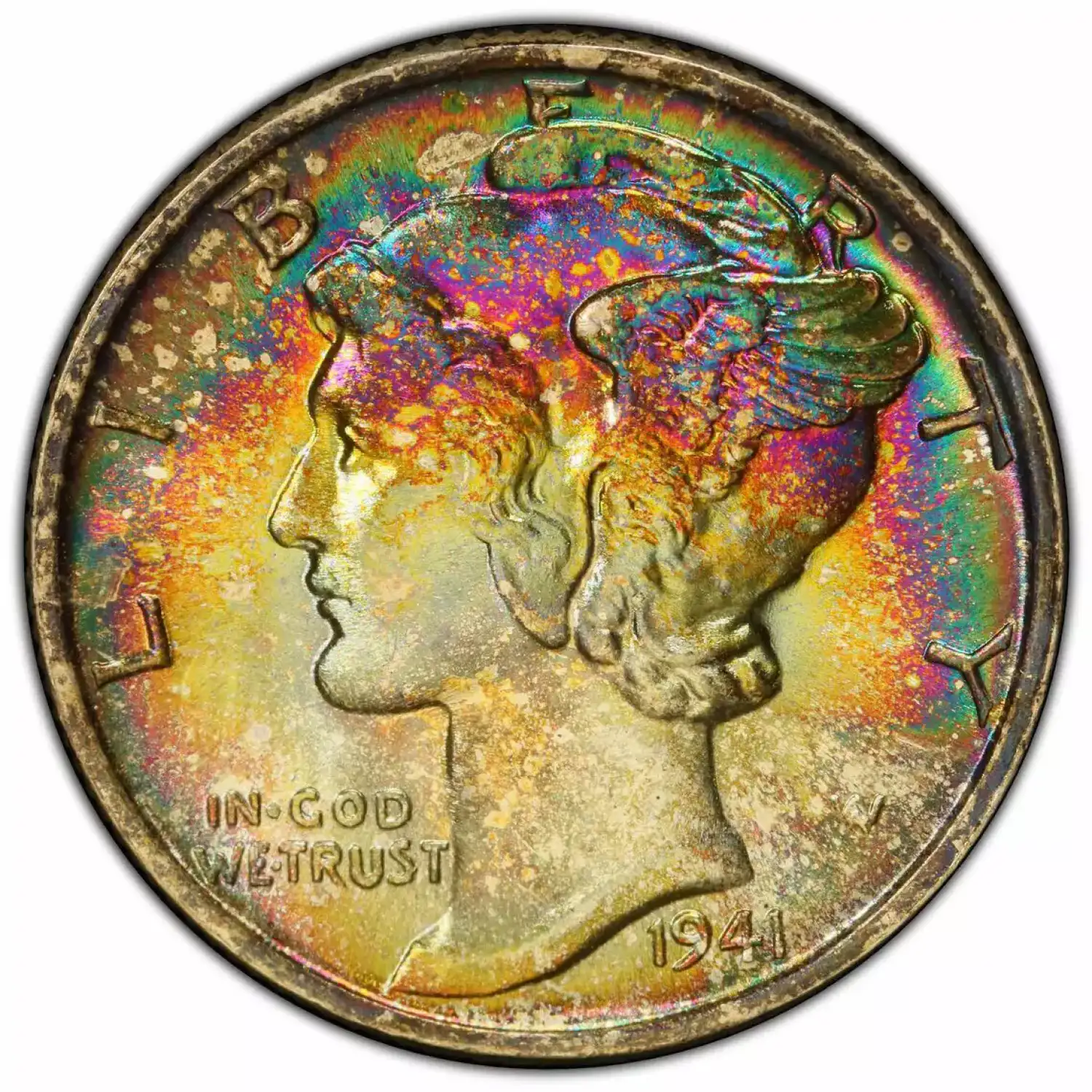 1941 10C PCGS MS68FB Rainbow Toned Mercury Dime