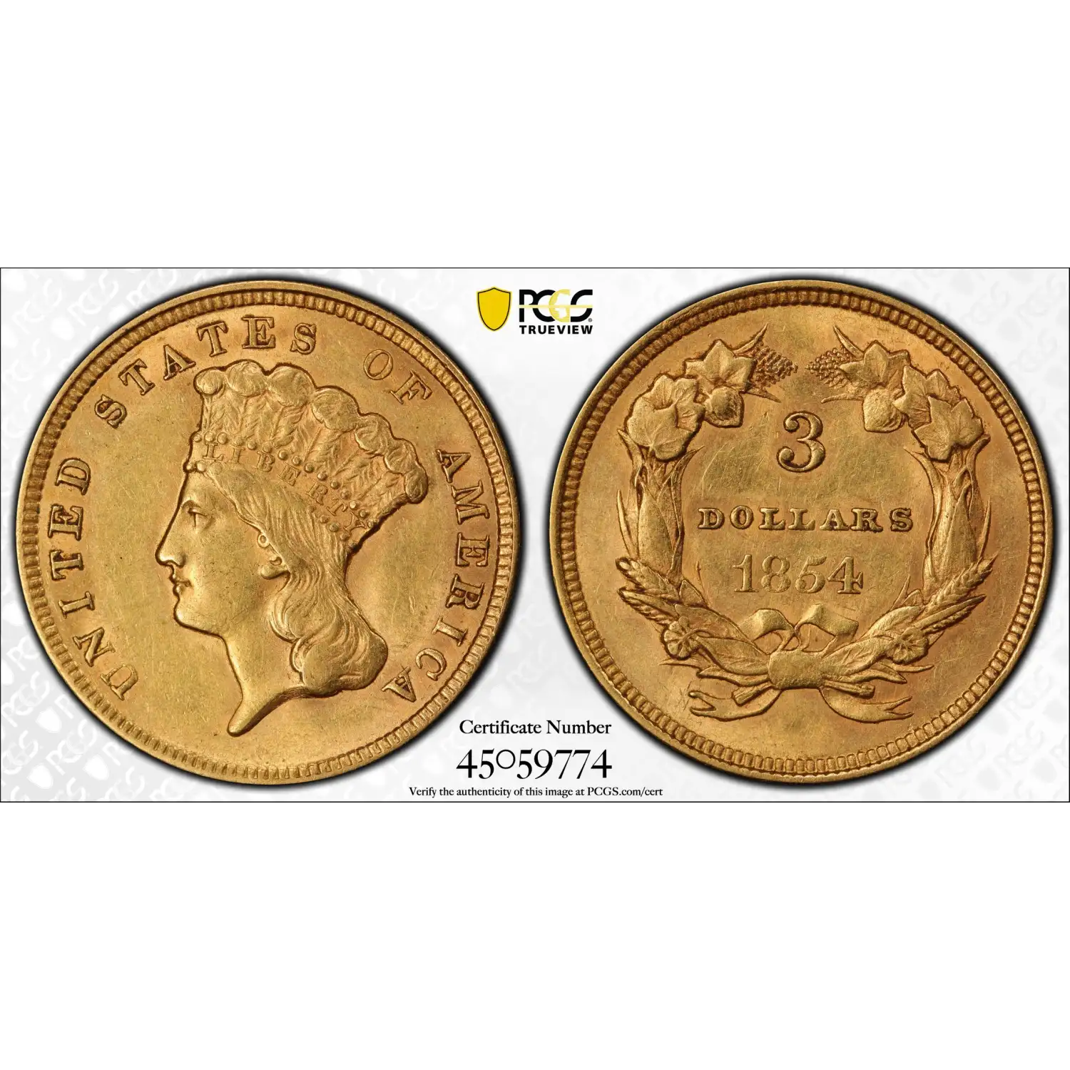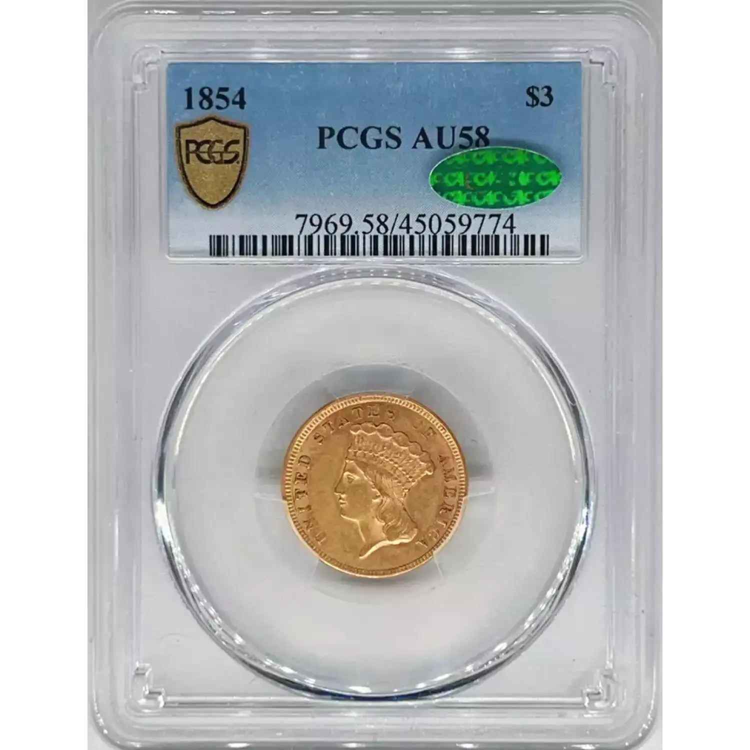 1854 $3 PCGS AU58 CAC Gold 3 Dollar