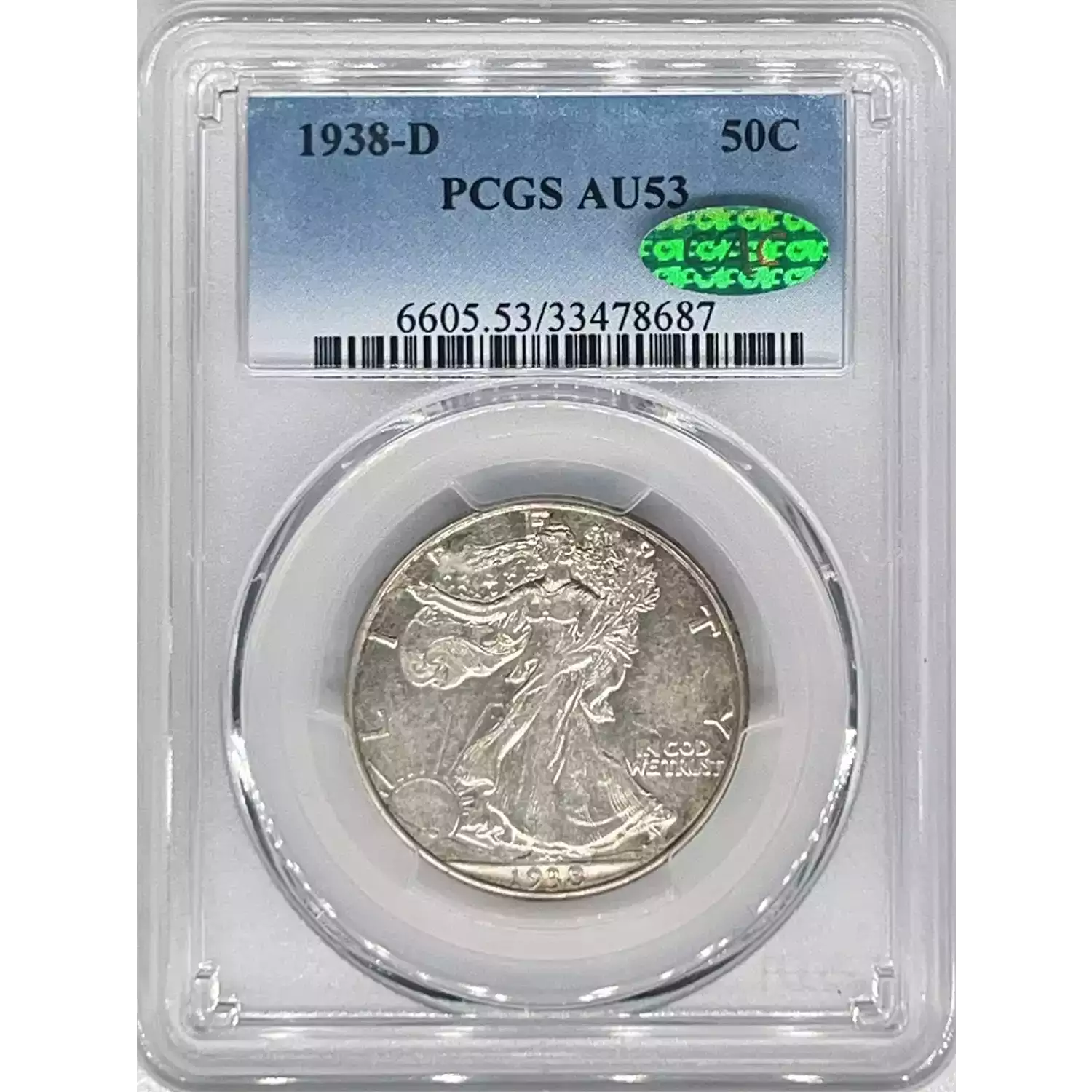 1938-D 50C PCGS AU53 CAC Walking Liberty Silver Half Dollar