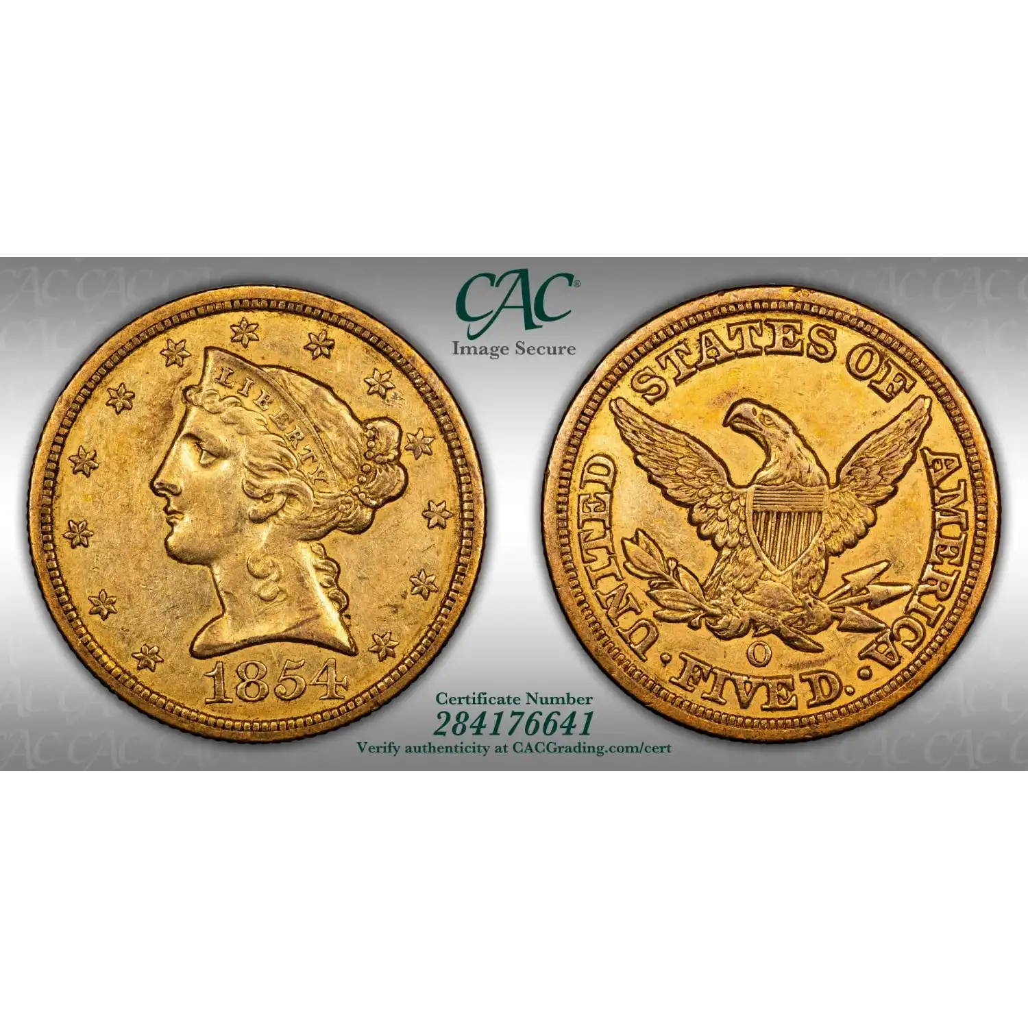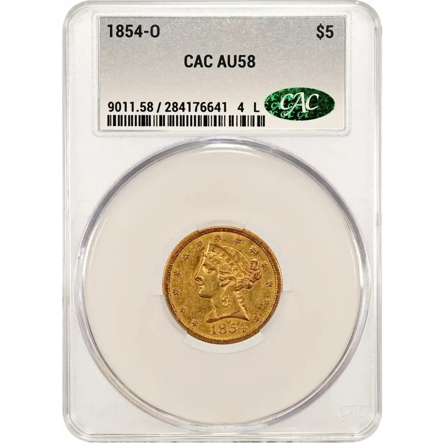 1854-O $5 Gold Liberty Head CACG AU58 CAC Gold Half Eagle 284176641