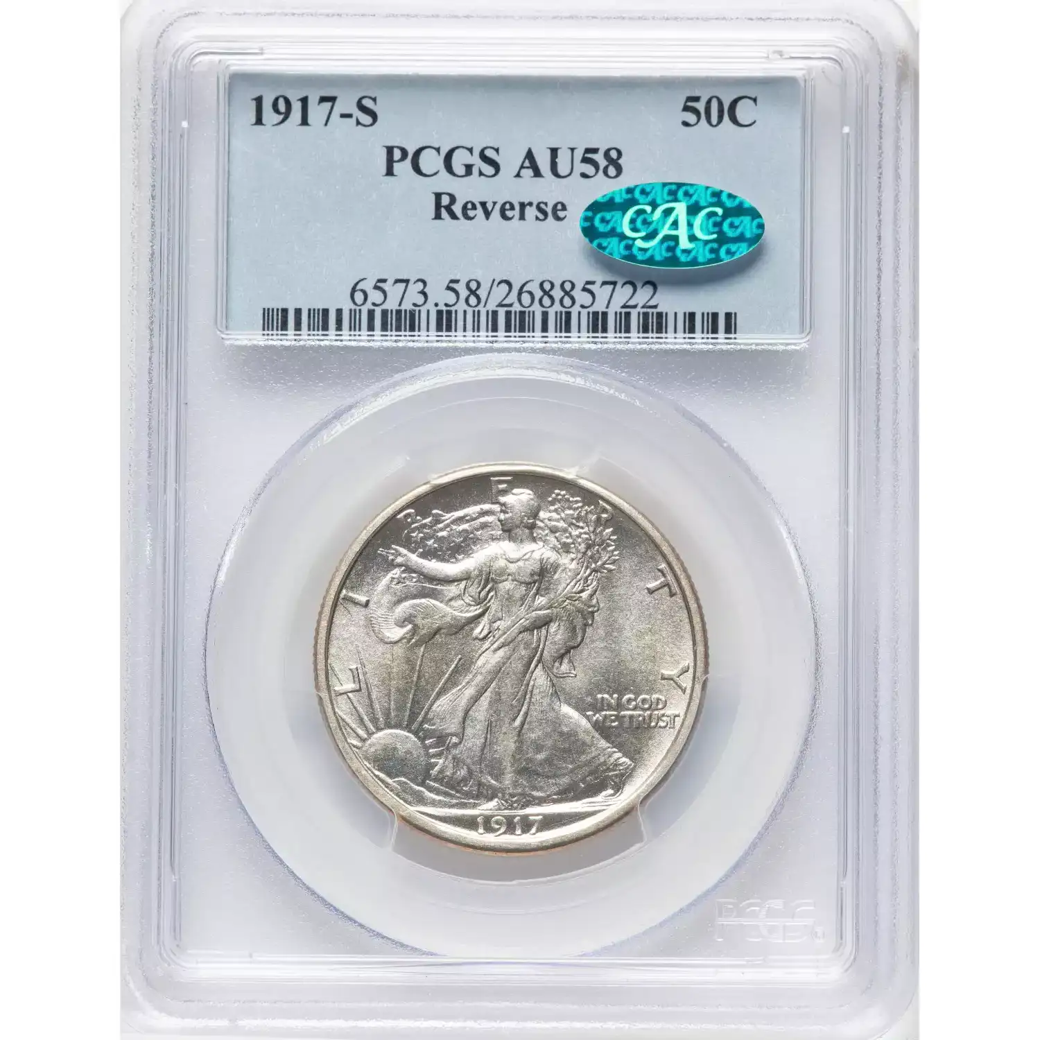 1917-S 50C ReversePCGS AU58 CAC Walking Liberty Half Dollar