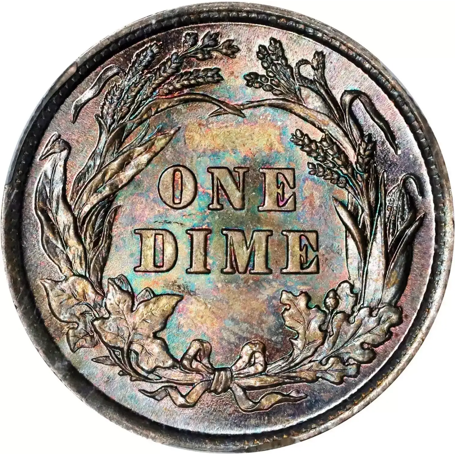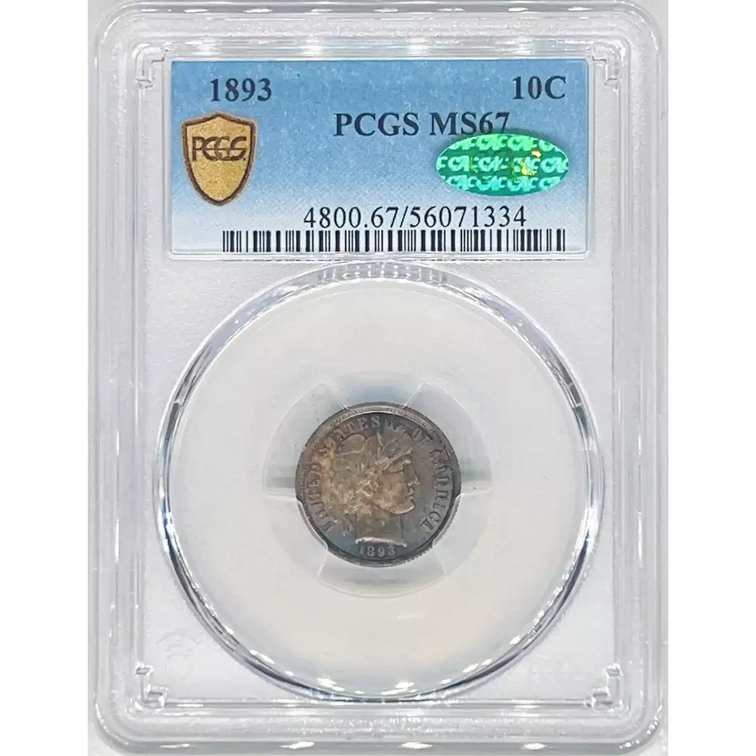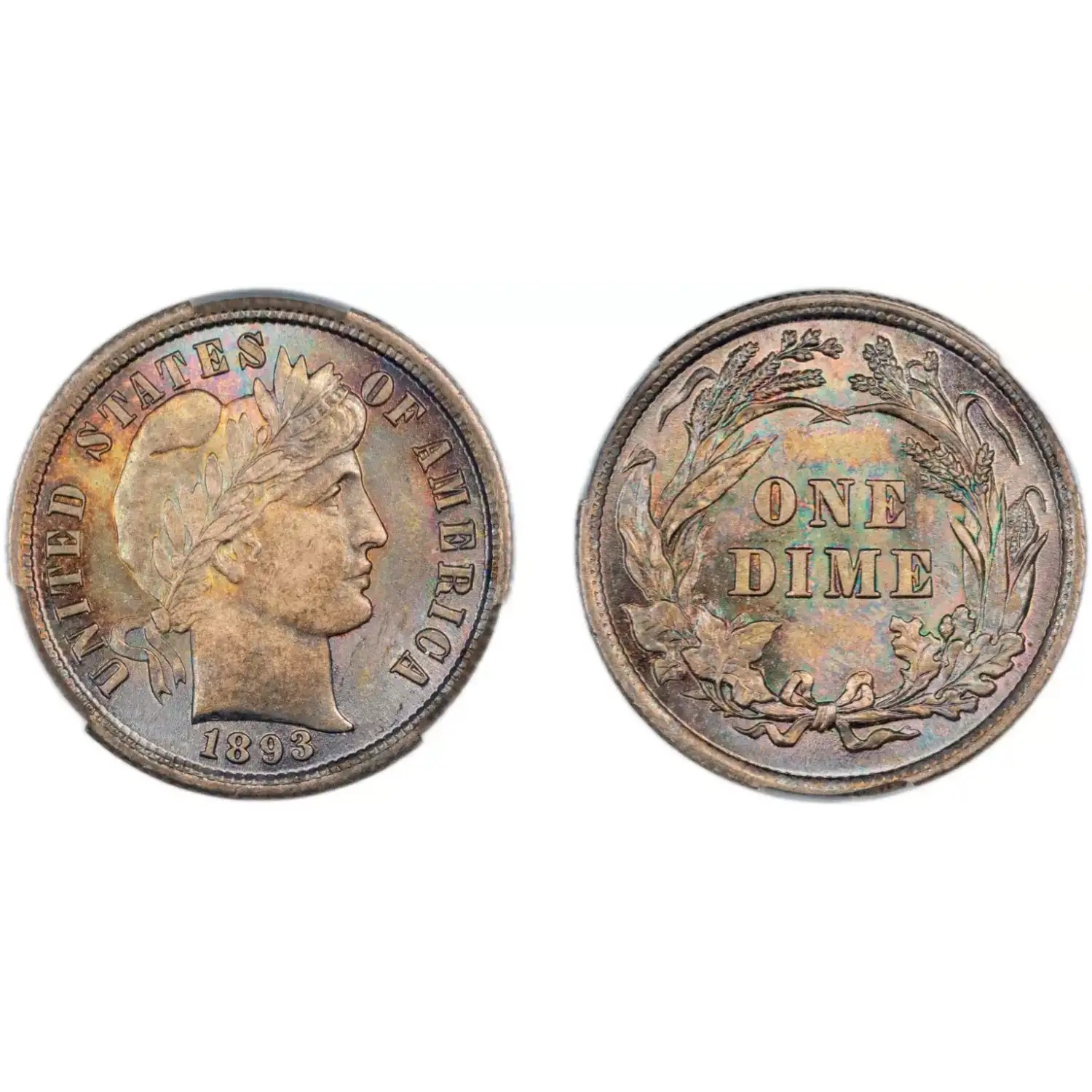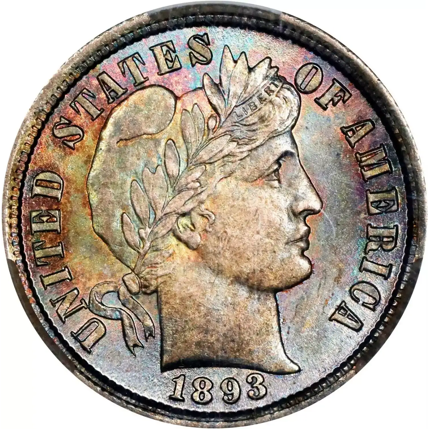 1893 10C PCGS MS67 CAC Rainbow Toned Barber Dime