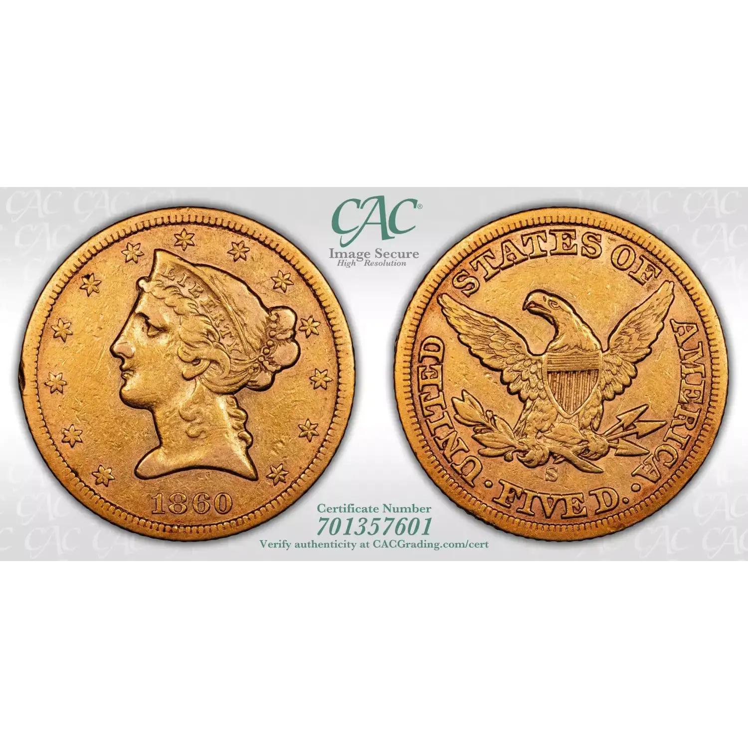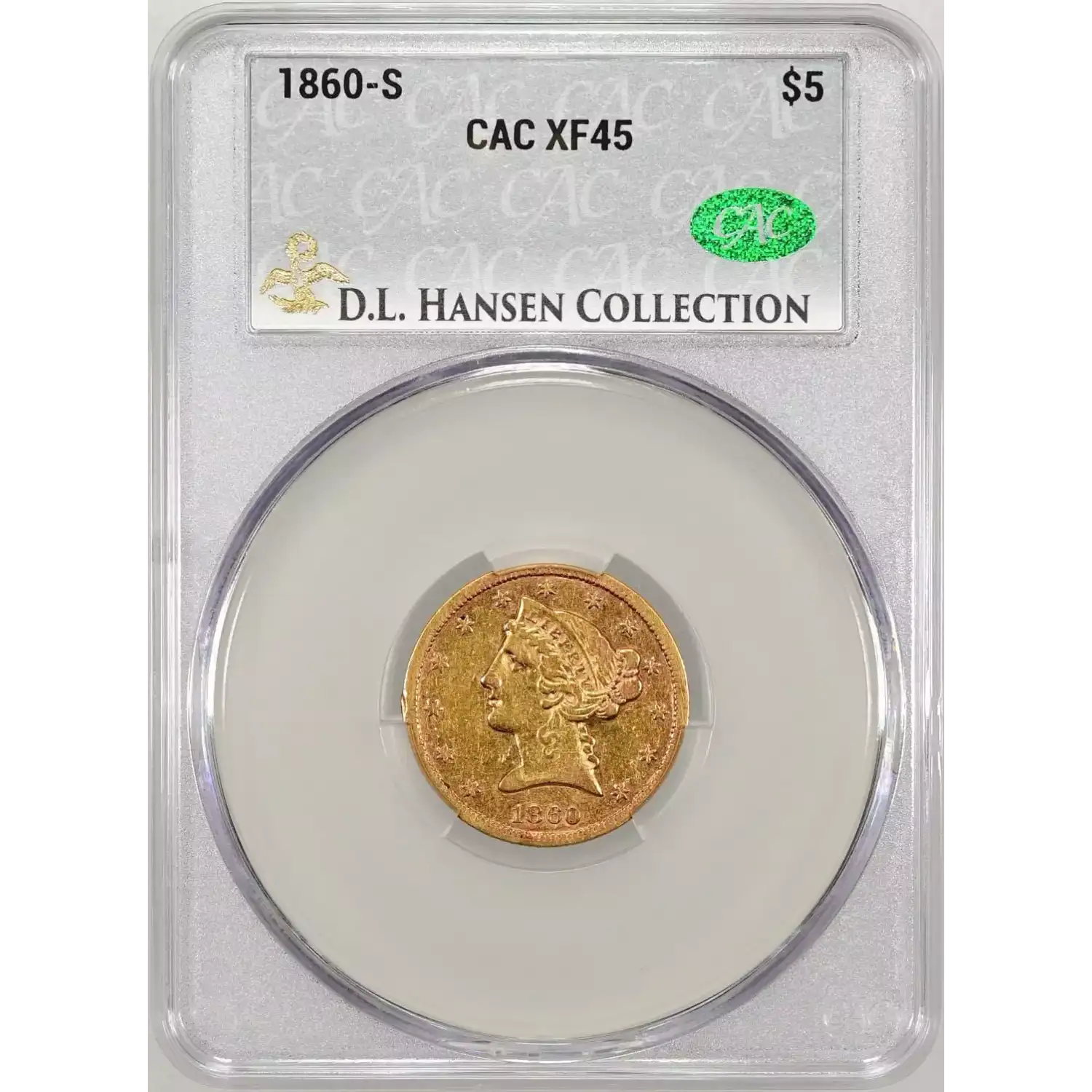 1860-S $5 Gold Liberty CACG XF45 CAC Gold Half Eagle D.L. Hansen Collection