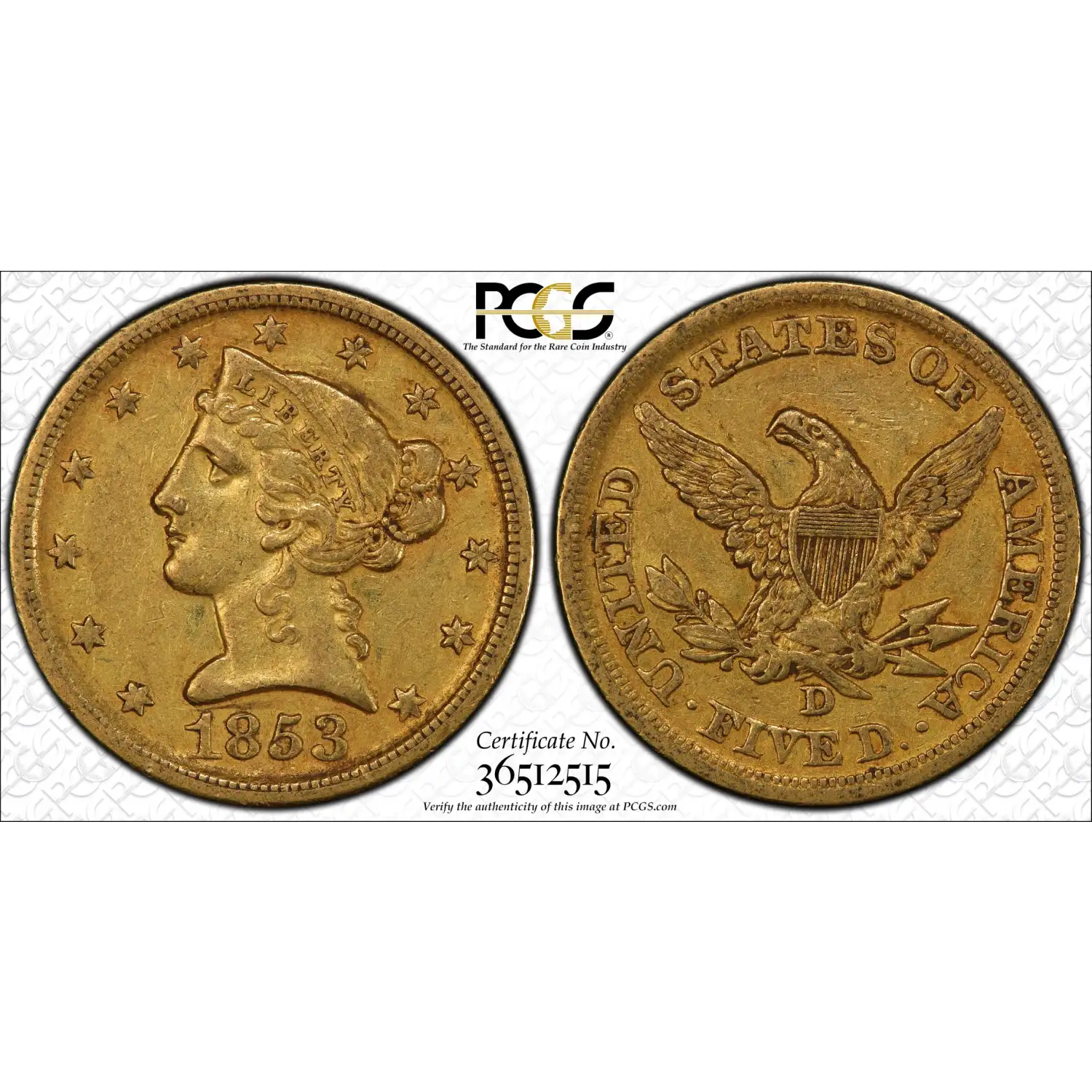 1853-D $5 Gold Liberty PCGS XF45 CAC Gold Half Eagle Large D