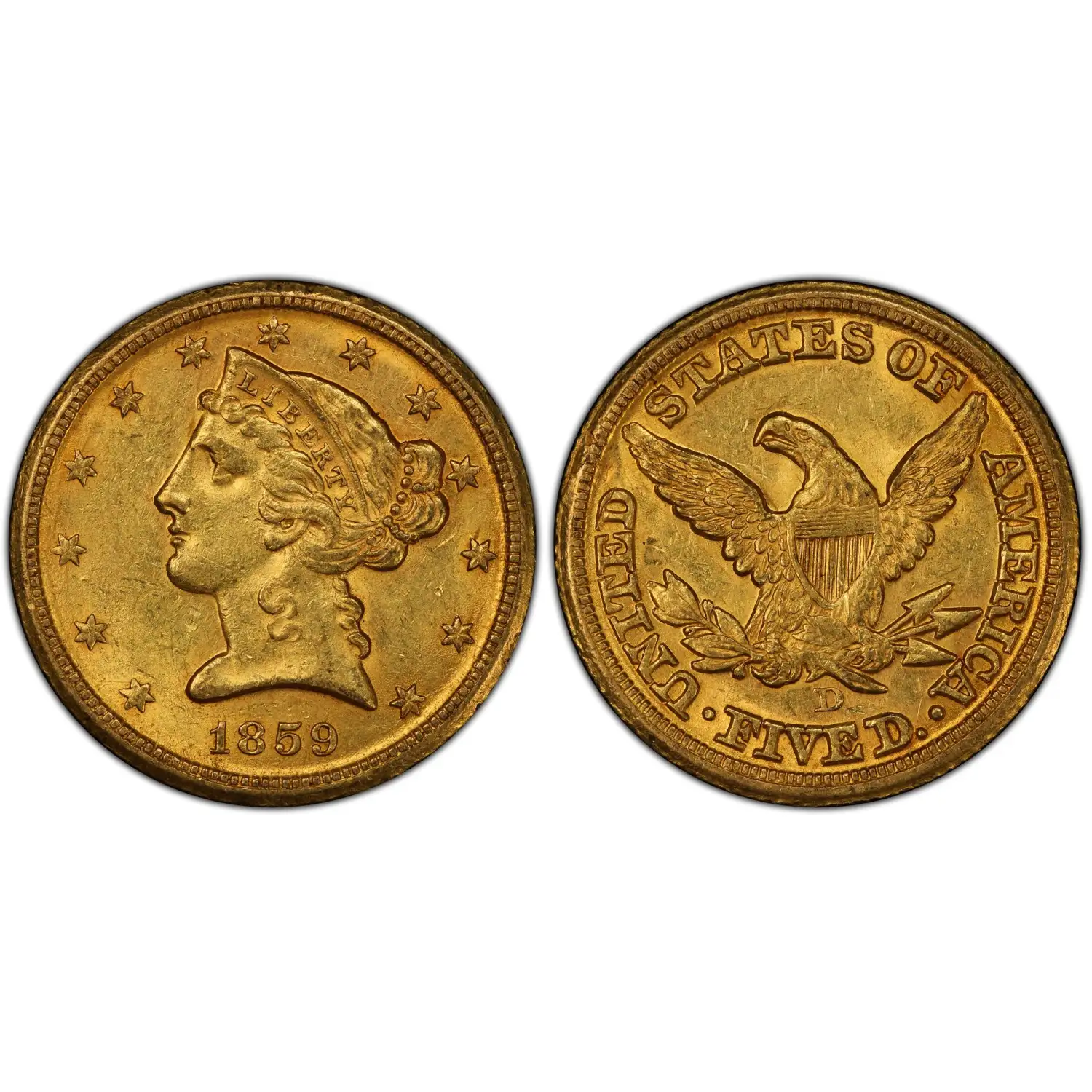 1859-D Gold Half Eagles Liberty Head PCGS MS-62 Medium D CAC