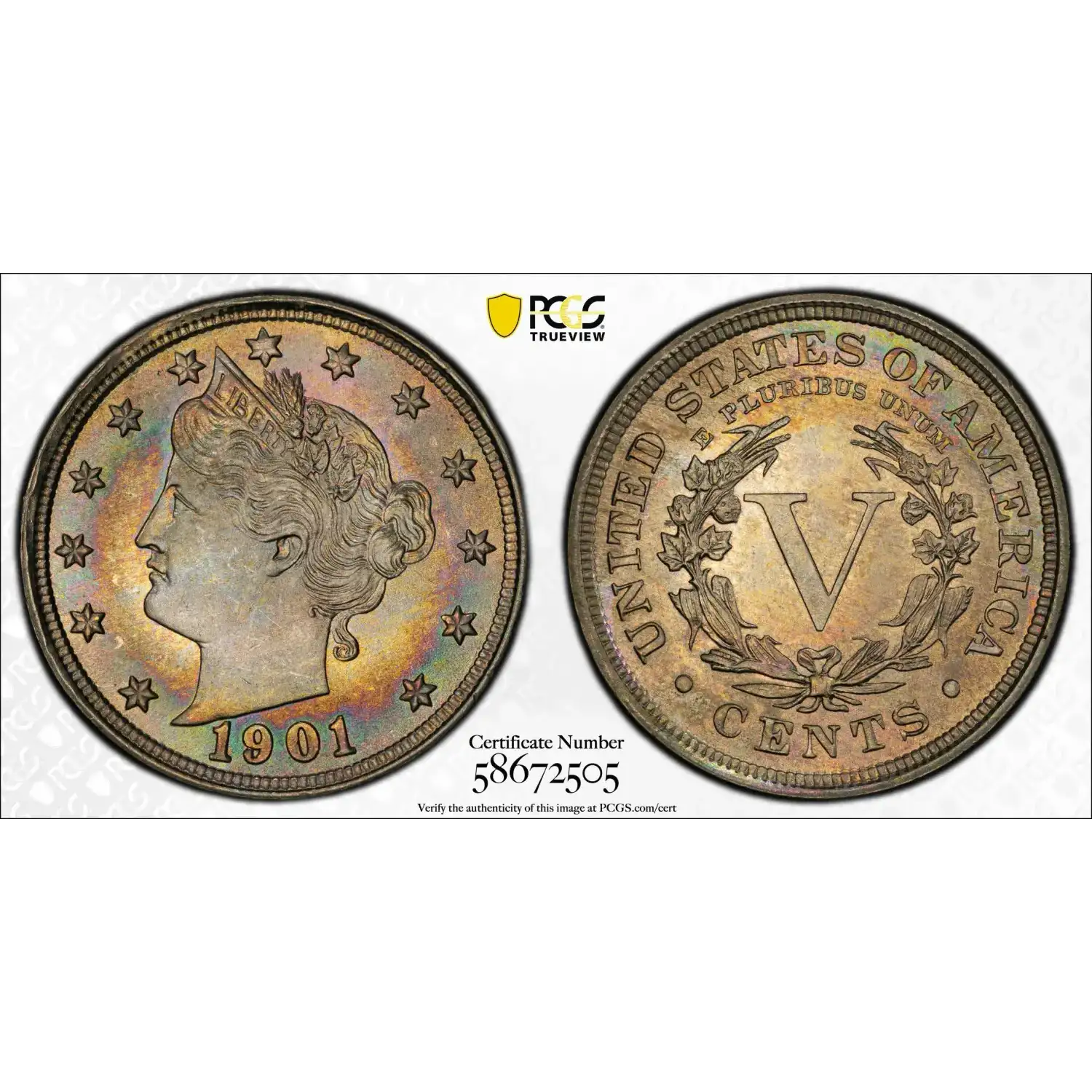 1901 5C PCGS MS66 Rainbow Toned V Nickel 58672505