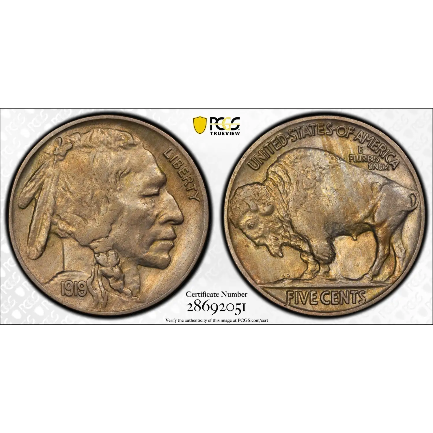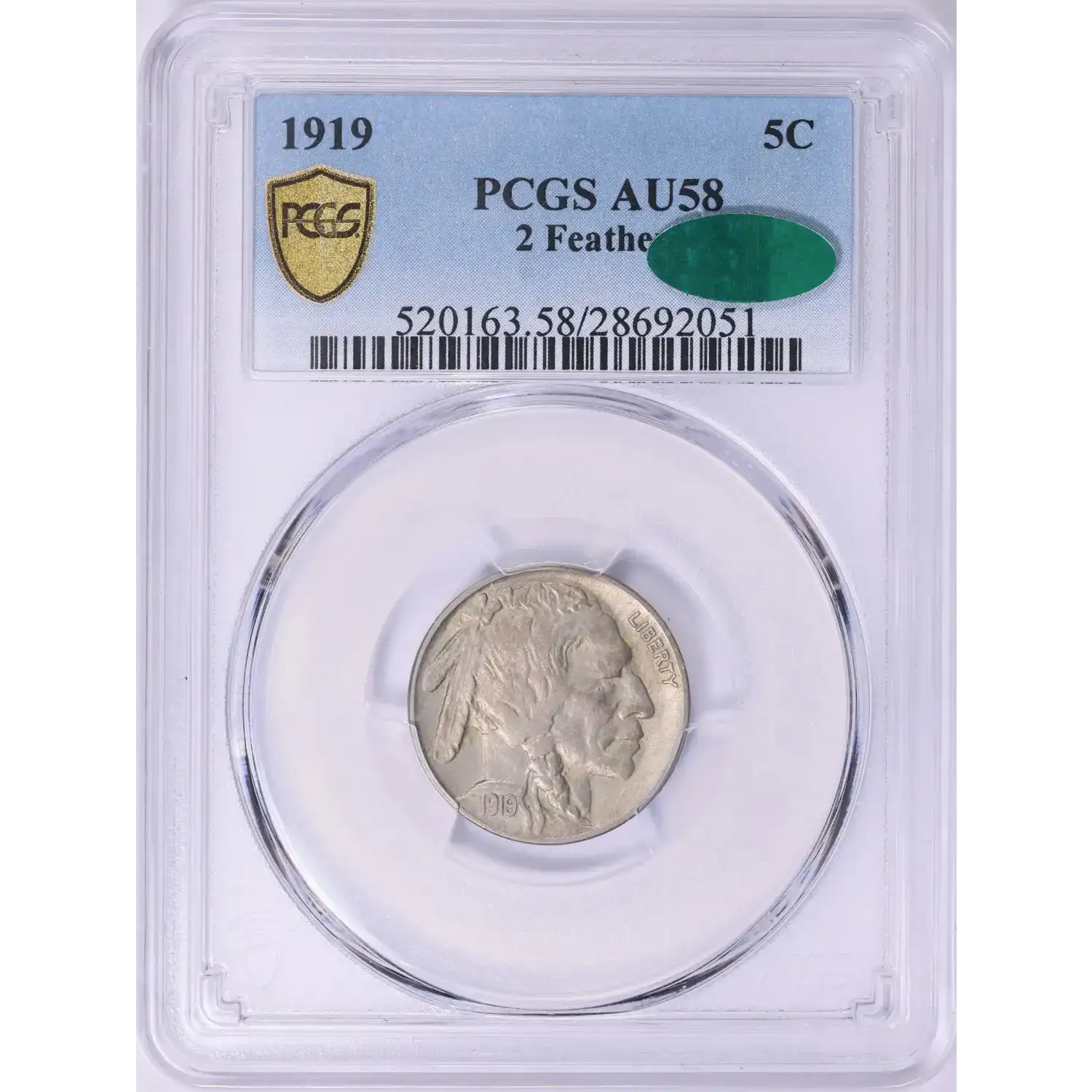 1919 5C PCGS AU58 CAC Buffalo Nickel 2 Feathers 28692051
