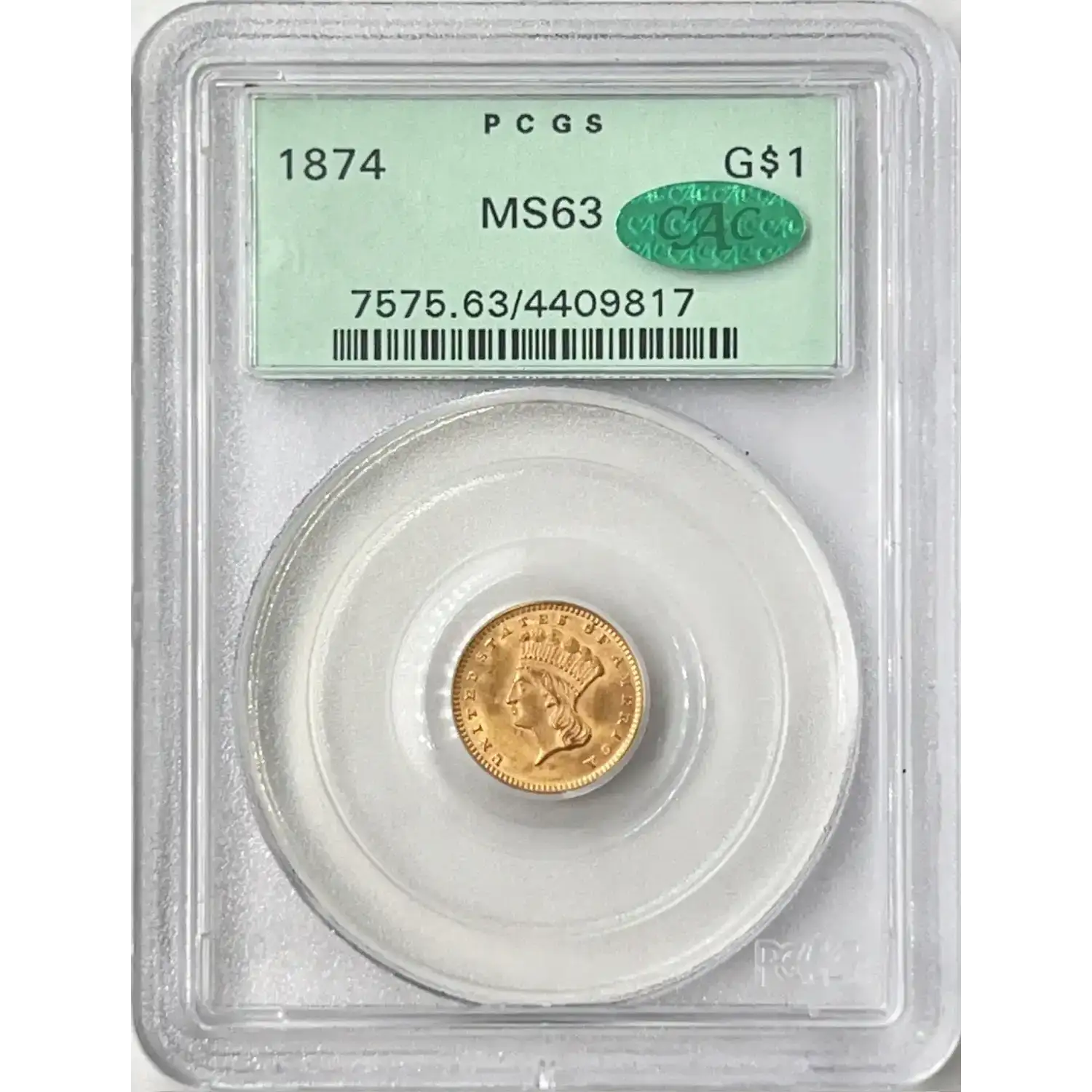 1874 G$1 PCGS OGH MS63 CAC Gold Princess Dollar 04409817