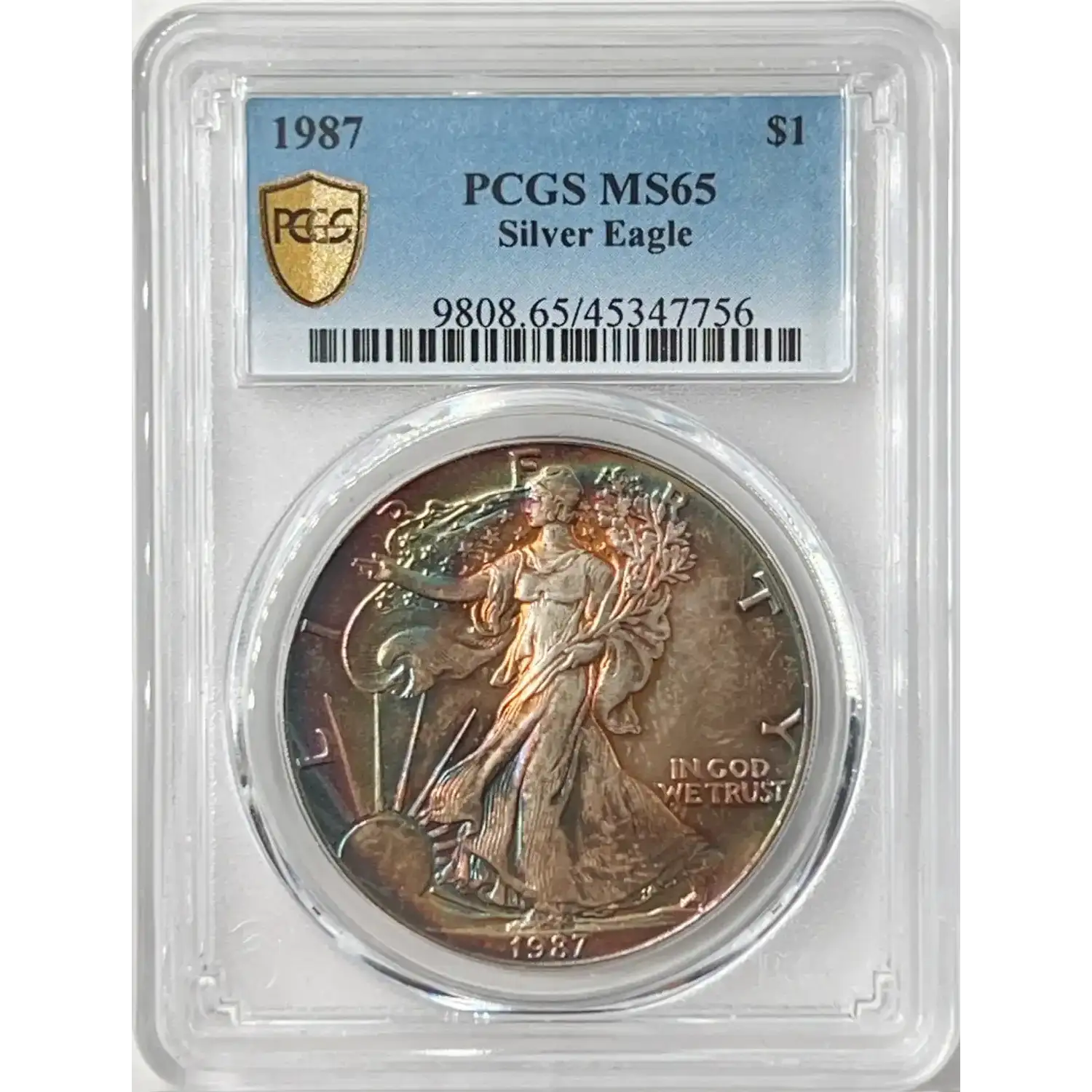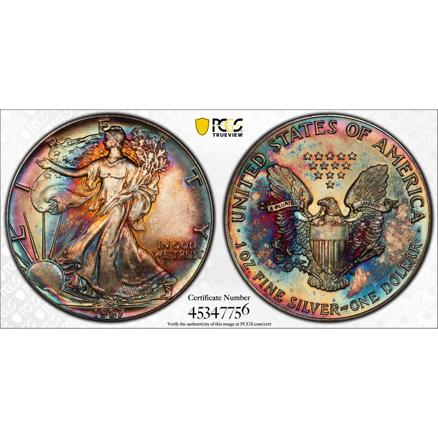 1987 $1 PCGS MS67 Rainbow Toned American Silver Eagle 45347756