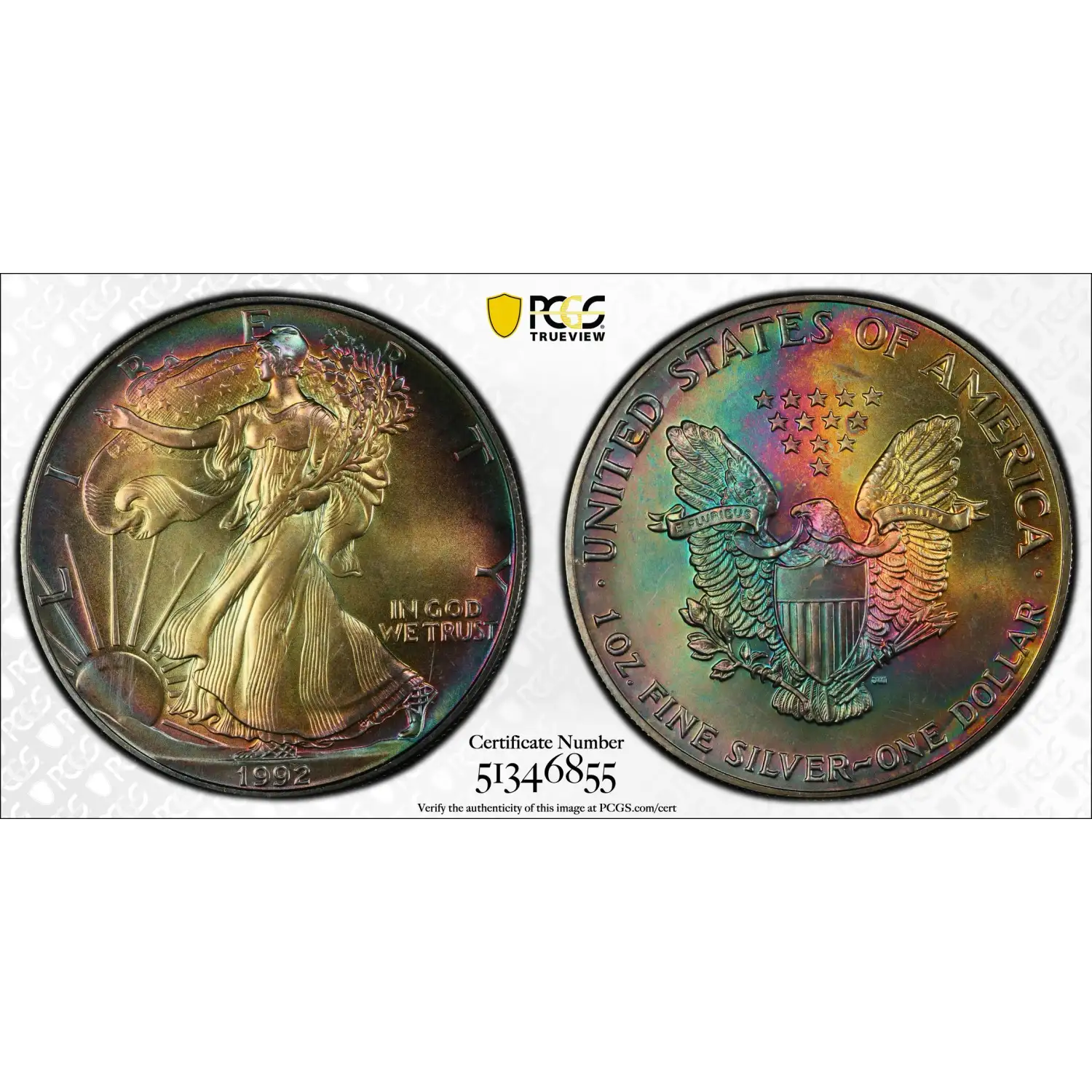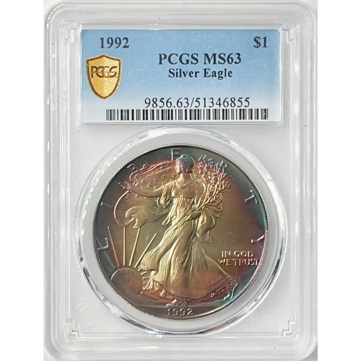 1992 $1 PCGS MS63 Rainbow Toned American Silver Eagle 51346855