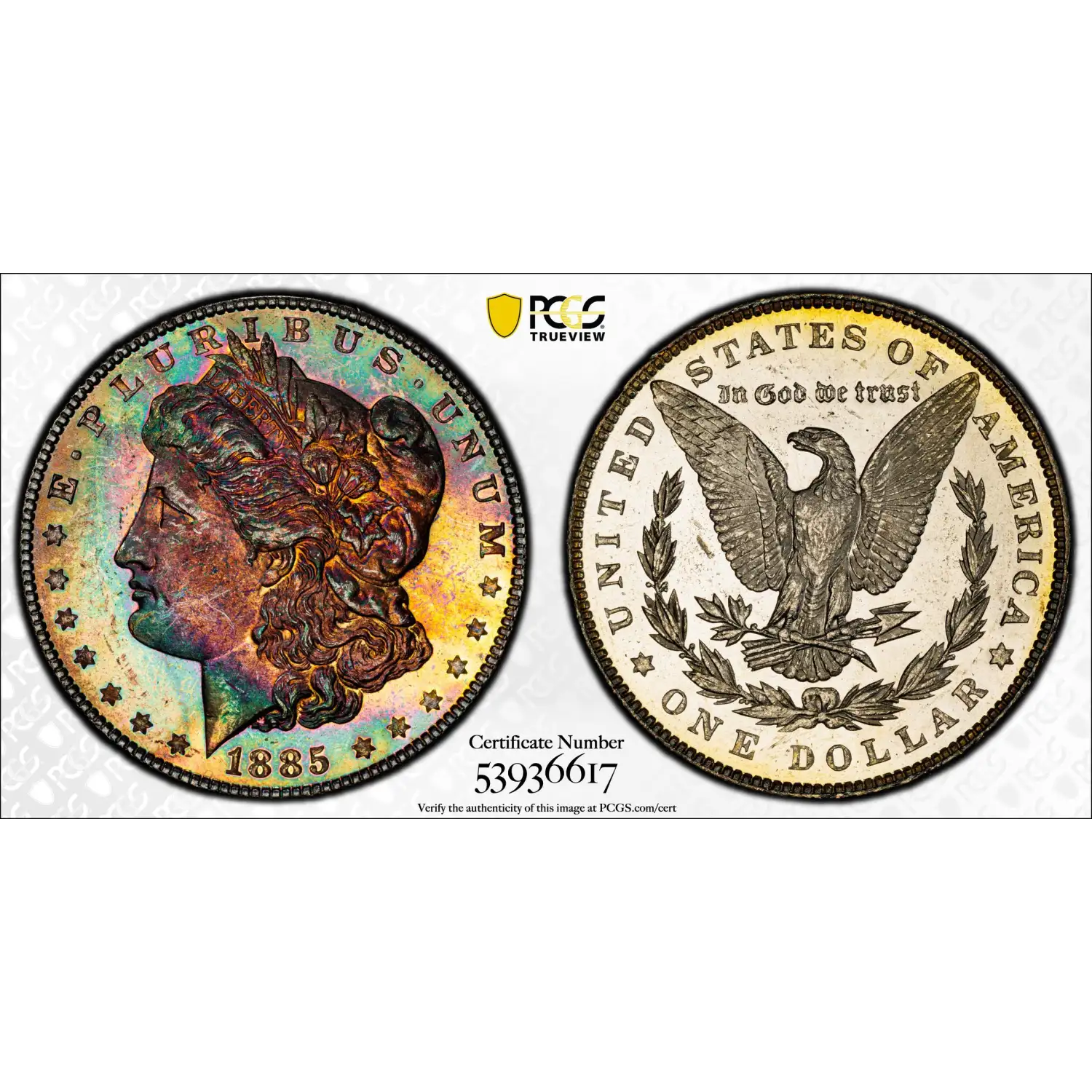 1885 $1 PCGS MS64PL CAC Rainbow Toned Morgan Silver Dollar 53936617