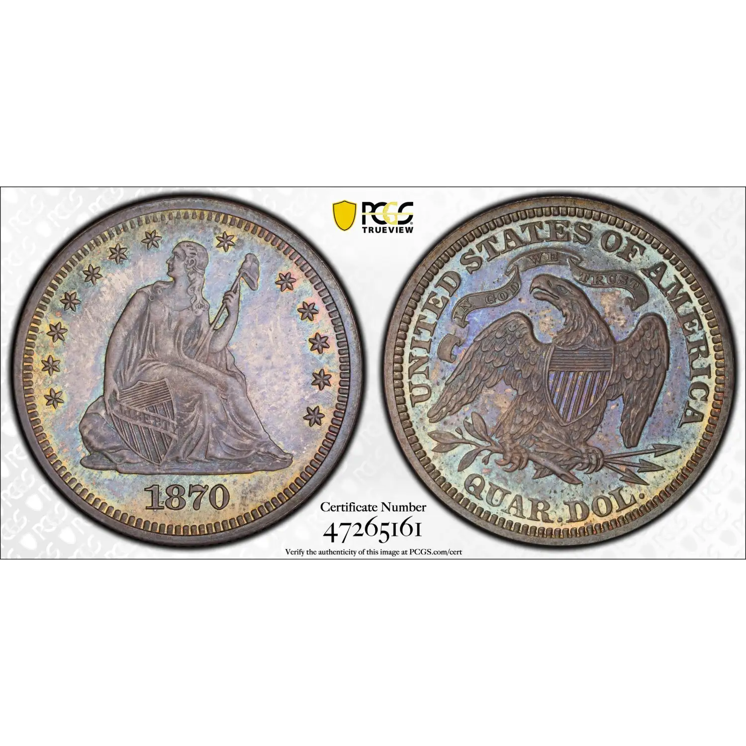 1870 25C PCGS PR65 Rainbow Toned Seated Liberty Quarter 47265161
