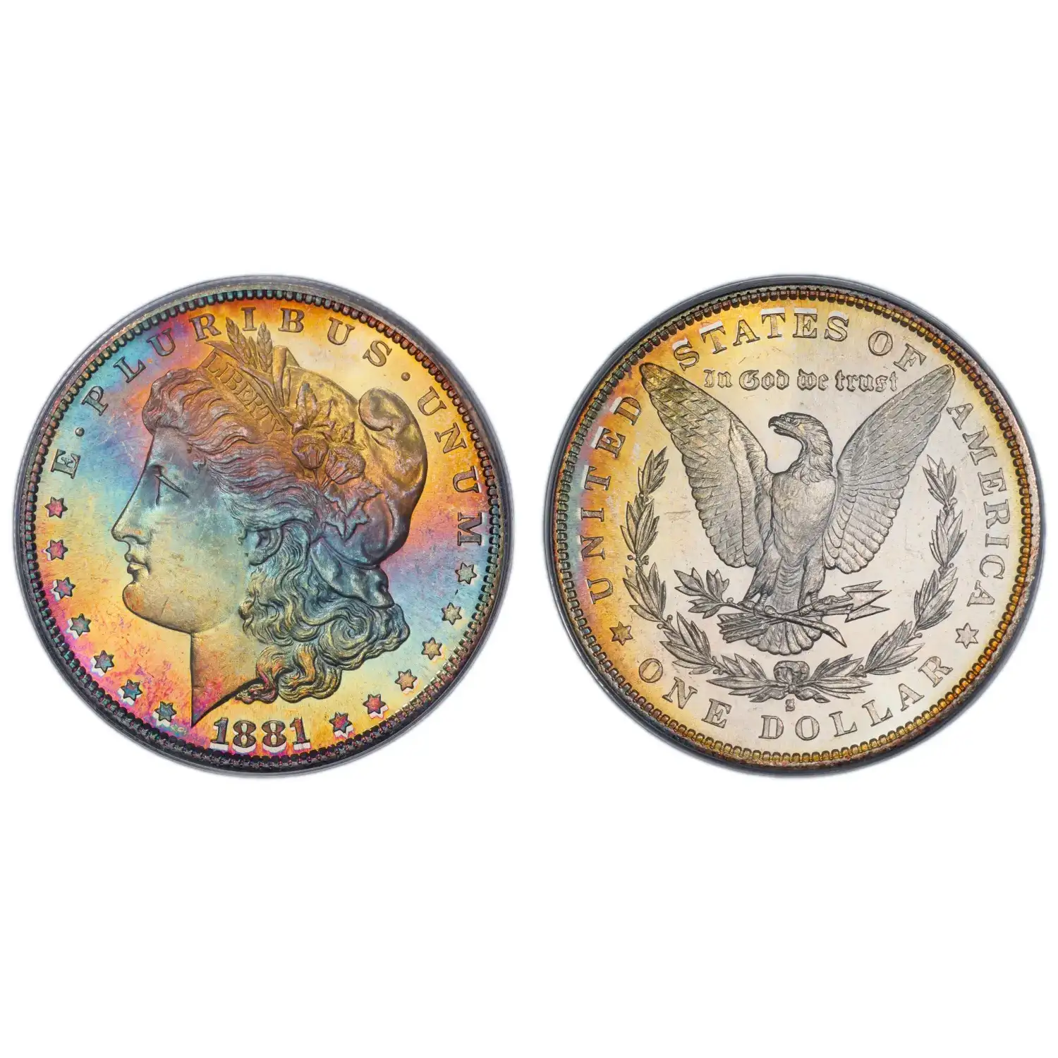 1881-S $1 PCGS OGH MS64PL Rainbow Toned Morgan Silver Dollar 01525627