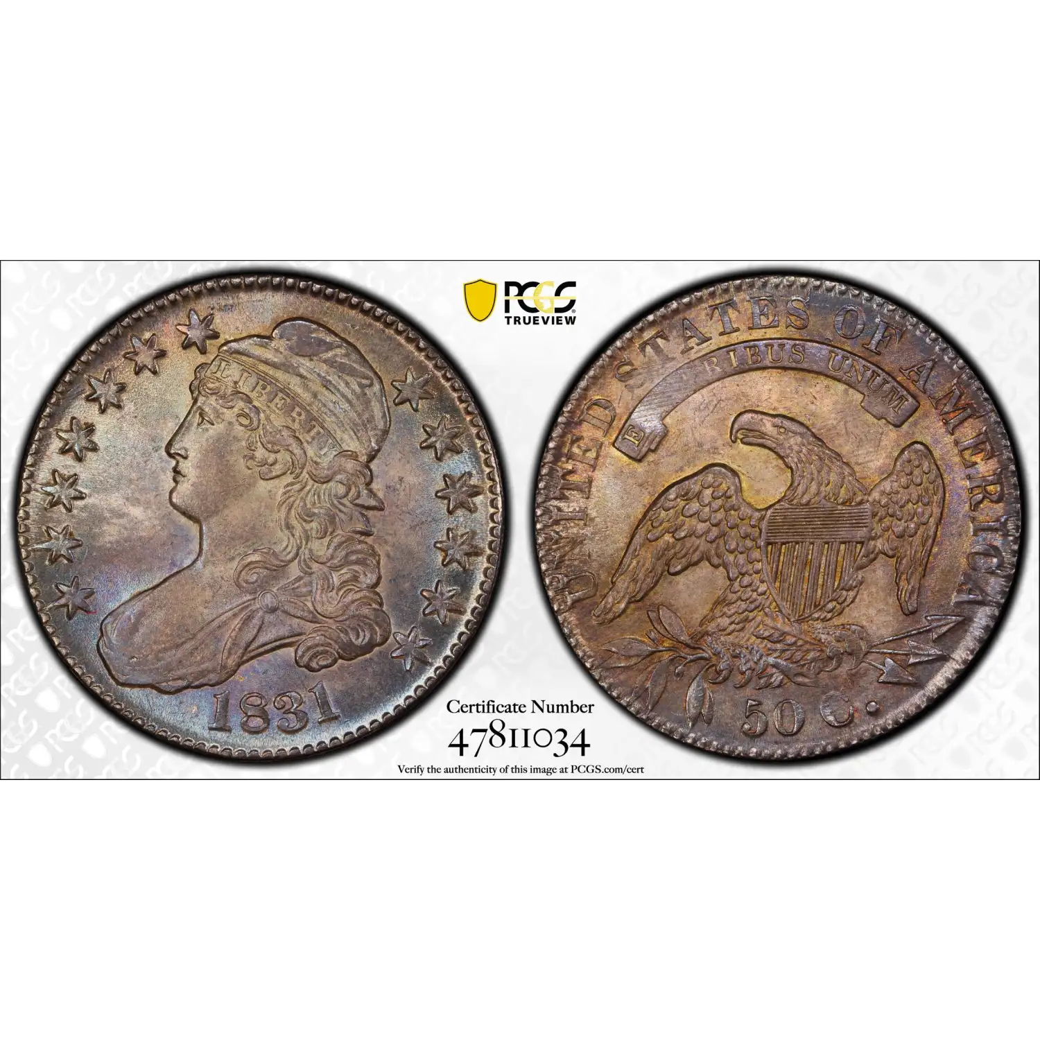 1831 50C PCGS MS65 Rainbow Toned Capped Bust Half Dollar 47811034