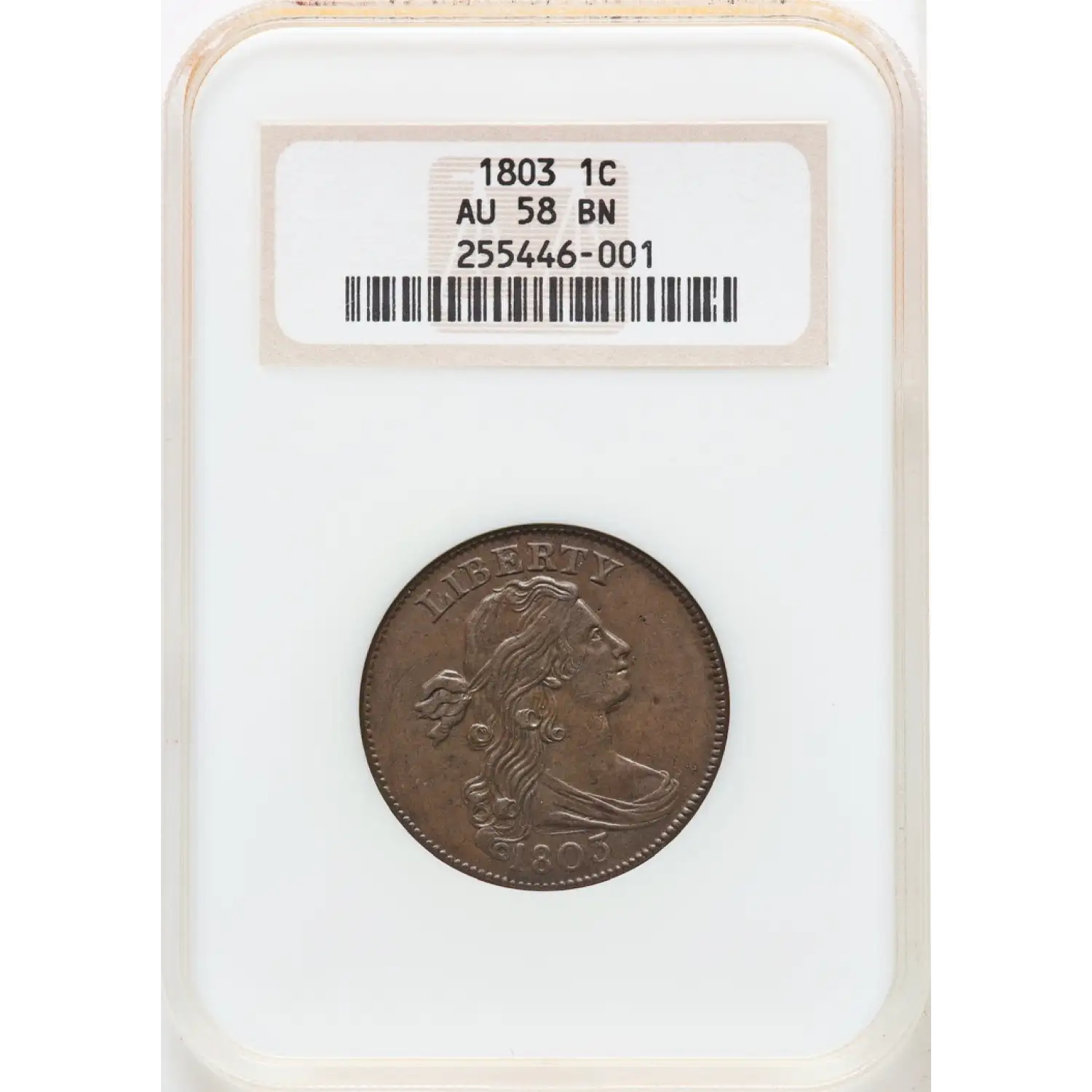 1803 1C NGC Fatty AU58 Draped Bust Large Cent Small Date, Small Fraction 255446-001