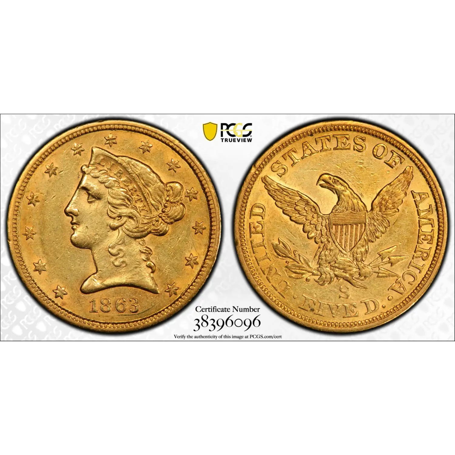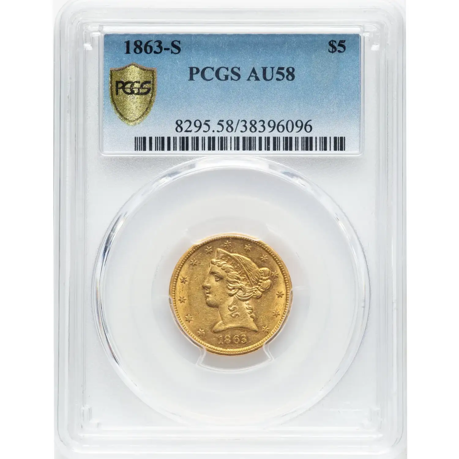 1863-S $5 Gold Liberty PCGS AU58 Gold Half Eagle Civil War Gold 38396096