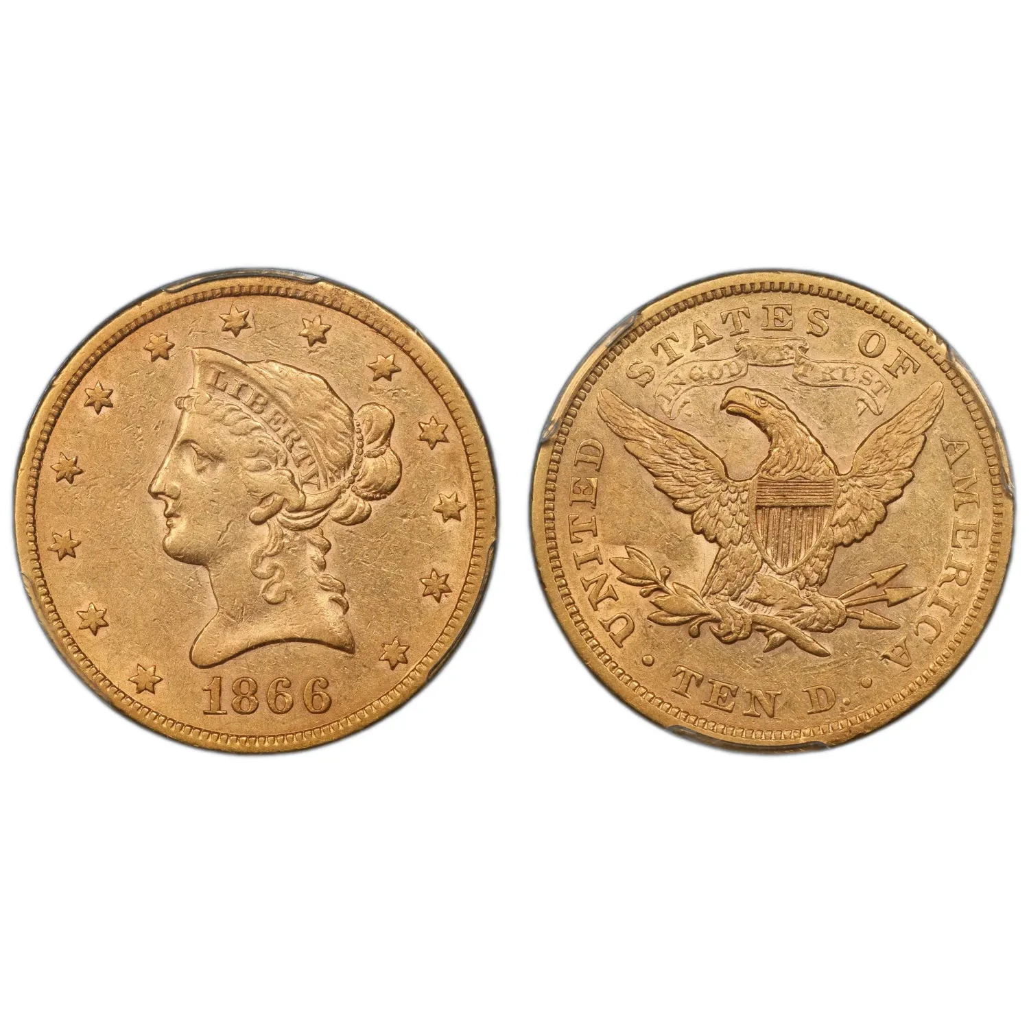 1866-S $10 Gold Liberty PCGS AU50 Gold Eagle Motto 81958448